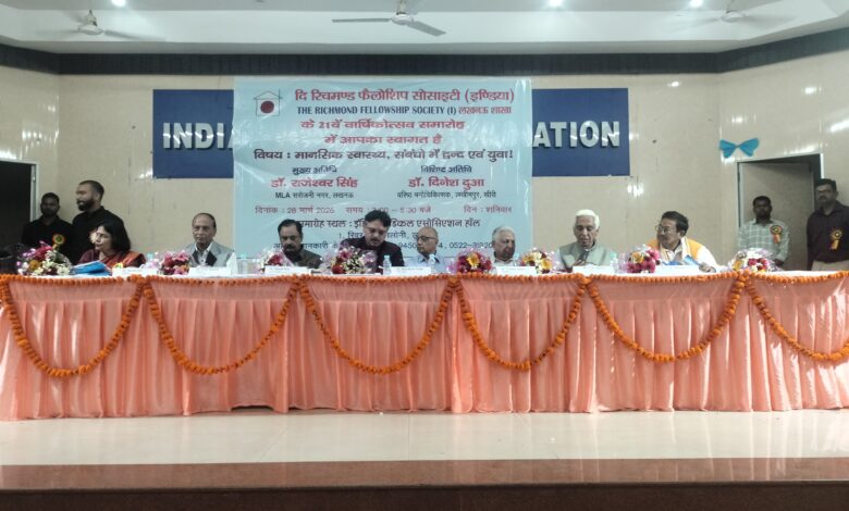 लखनऊ. दी रिचमंड फैलोशिप सोसाइटी( इंडिया) की लखनऊ शाखा द्वारा अपने 21वें वार्षिकोत्सव के अवसर पर मानसिक स्वास्थ्य ,संबंधों में द्वंद एवं युवा विषय पर एक कार्यशाला का आयोजन इंडियन मेडिकल एसोसिएशन भवन में आज किया गया. जिसमें मुख्य अतिथि के रूप में सरोजिनी नगर विधायक डॉ राजेश्वर सिंह उपस्थित रहे .डॉ.दिनेश दुआ मनोचिकित्सक लखीमपुर खीरी विशिष्ट अतिथि थे।