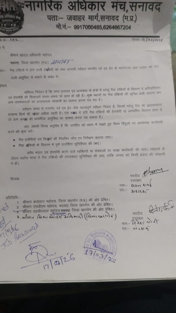 जिसमें नागरिक अधिकार मंच ने मांग की है कि आगामी त्यौहार जैसे निमाड़ के महापर्व गणगौर ,रामनवमी,एवं ईद के चलते आम जनता को नियम अनुसार सिलेंडर मुहैया कराये जाए और सिलेंडर की कालाबाजारी रोकने के लिए होटलो, व्यवसायिक प्रतिष्ठानों एवं रेहड़ी वालों के पास कमर्शियल सिलेंडर ना मिलने पर उनके विरुद्ध नियम अनुसार कार्यवाही भी की जाये।