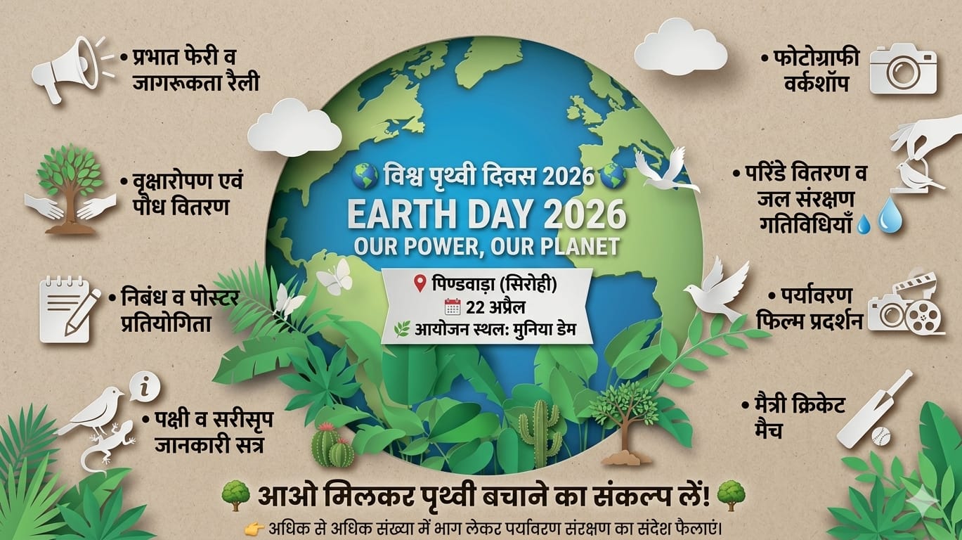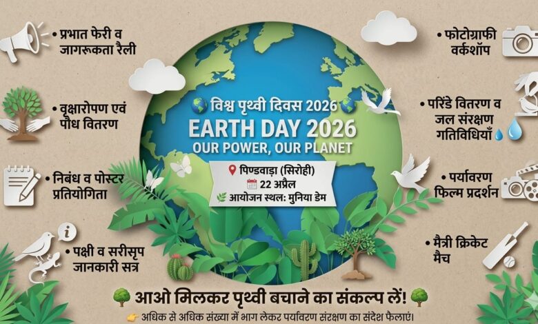 पिण्डवाड़ा (सिरोही)। विश्व पृथ्वी दिवस के अवसर पर 22 अप्रैल को जिले में विविध कार्यक्रमों का आयोजन किया जाएगा। राजस्थान सरकार के पर्यावरण एवं जलवायु परिवर्तन मंत्रालय के निर्देशानुसार आयोजित होने वाले इस कार्यक्रम की इस वर्ष की वैश्विक थीम “Our Power, Our Planet” रखी गई है।